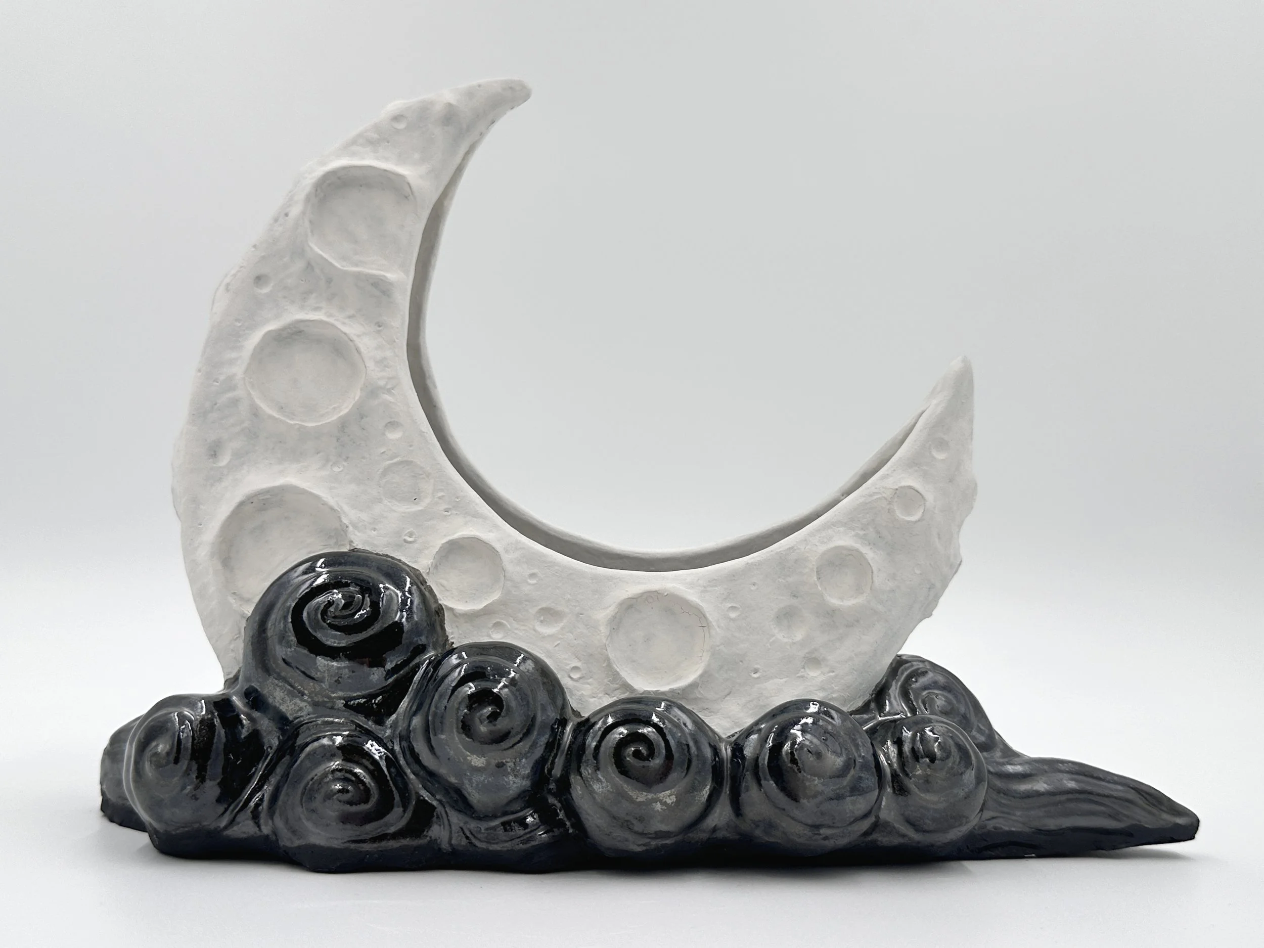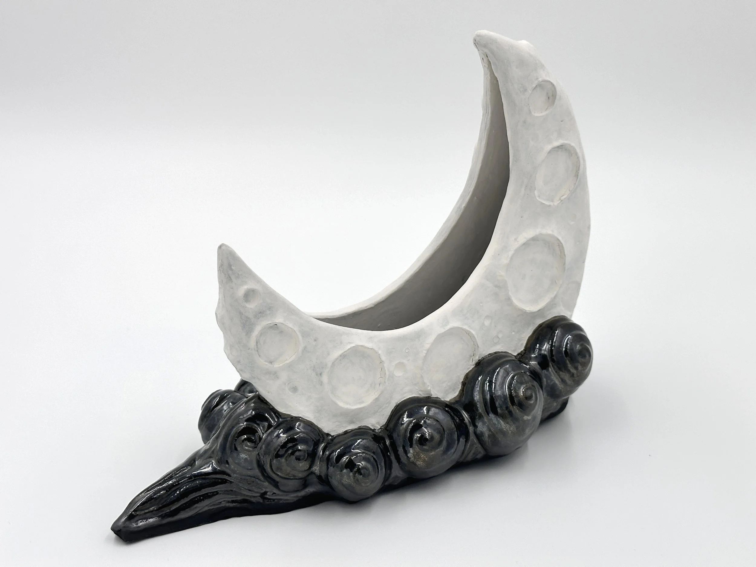 A crescent moon rises from a bed of restless clouds, suspended between two worlds. The moon's matte white surface is pocked with craters — quiet, still, ancient — while below, the clouds churn with a deep mirror glaze, their spiral forms drawn from Japanese artistic tradition. In Japanese-American experience, this tension is familiar: the luminous and the turbulent, the serene and the churning, forever holding each other up.